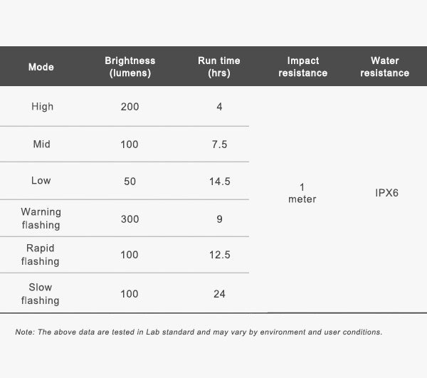 - Eye-catching warning flash for daytime riding and multiple brightness levels for various ridings